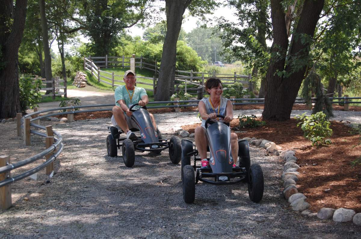 Weave in and around the trees while racing around the track with the foot powered pedal cars.