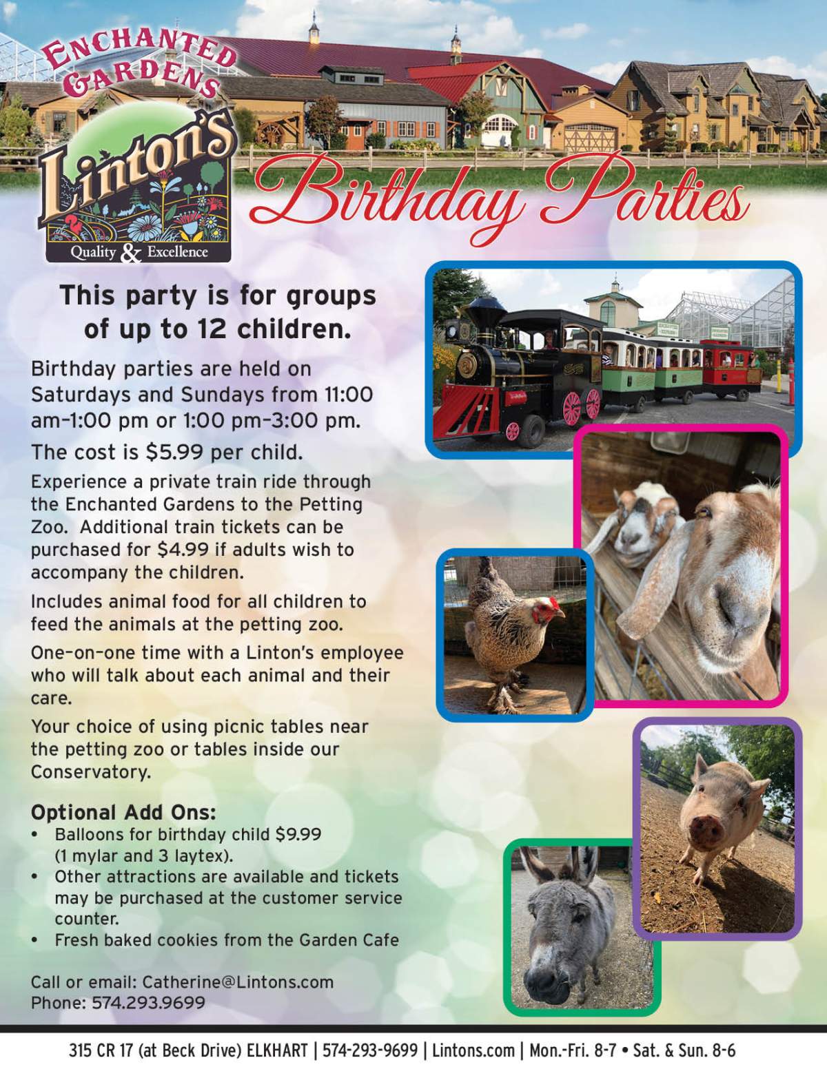 Enjoy a fun, relaxing narrated tour of our 9 acre Garden Centre aboard Linton’s Enchanted Express Train. We’ll traverse past our display beds, through our plant nursery, around our pond, past the petting zoo and inside the train tunnel before pulling up to the Train Depot.